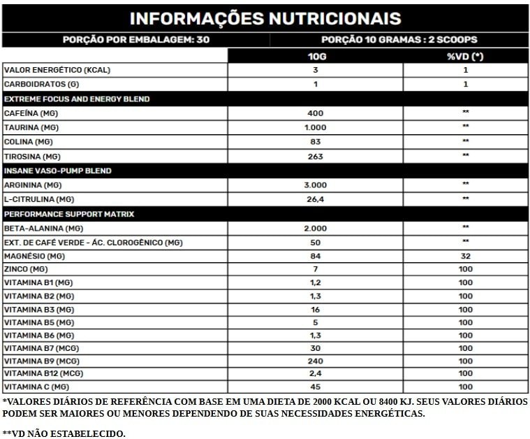 Ingredientes: Arginina, Beta Alanina, Maltodextrina, Taurina, Cafeína, Tirosina, Bisgliscinato de Magnésio, Bitartarato de Colina, Extrato de Café Verde, Ácido Ascórbico, L-Citrulina, Nicotinamida, Bisglicinato de Zinco, Pantotenato de Sódio, Riboflavina, Piridoxina, Tiamina, Ácido Fólico, Biotina, Metilcobalamina, Acidulante Ácido Cítrico (INS 330) Aromatizante Artificial idêntico ao Natural, Antiumectante Dióxido de Silício (INS 551), Edulcorante Sucralose (INS 955).